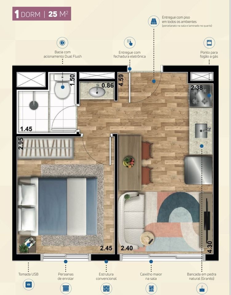 Área Total: 25 m²Área Privativa: 25 m²